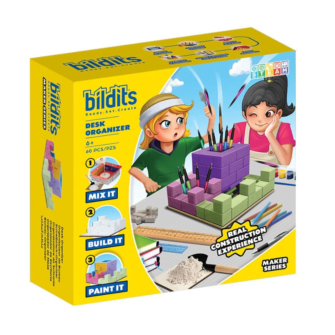 Get organized with the Desk Organizer kit! This set lets kids build a functional and stylish pen holder with a phone holder. Use real building materials to create a practical and personalized piece for your desk.