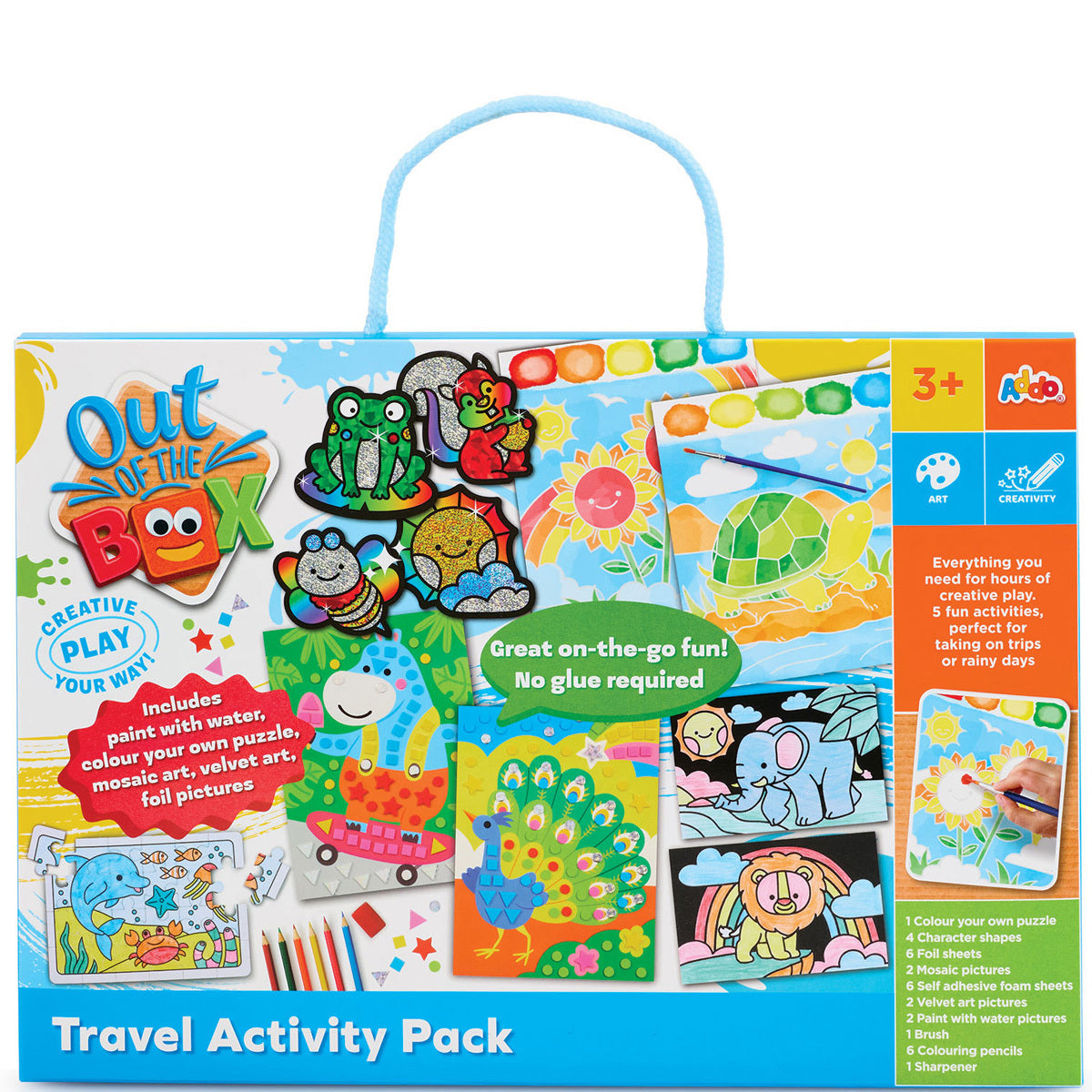 In a handy carry case with a handle, this artistic set is designed to be compact and portable while providing endless entertainment for children. Inspire imagination and creative play with the Travel Activity Pack from Out of the Box.